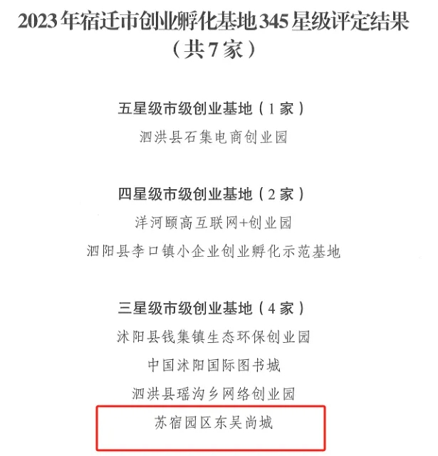近日,2023年宿遷市創(chuàng )業(yè)孵化基地345星級評定結果發(fā)布,宿遷市蘇宿園區建設發(fā)展有限公司服務(wù)項目園區公舍東吳尚城創(chuàng )業(yè)孵化基地榮獲2023年宿遷市創(chuàng )業(yè)孵化基地三星級稱(chēng)號。