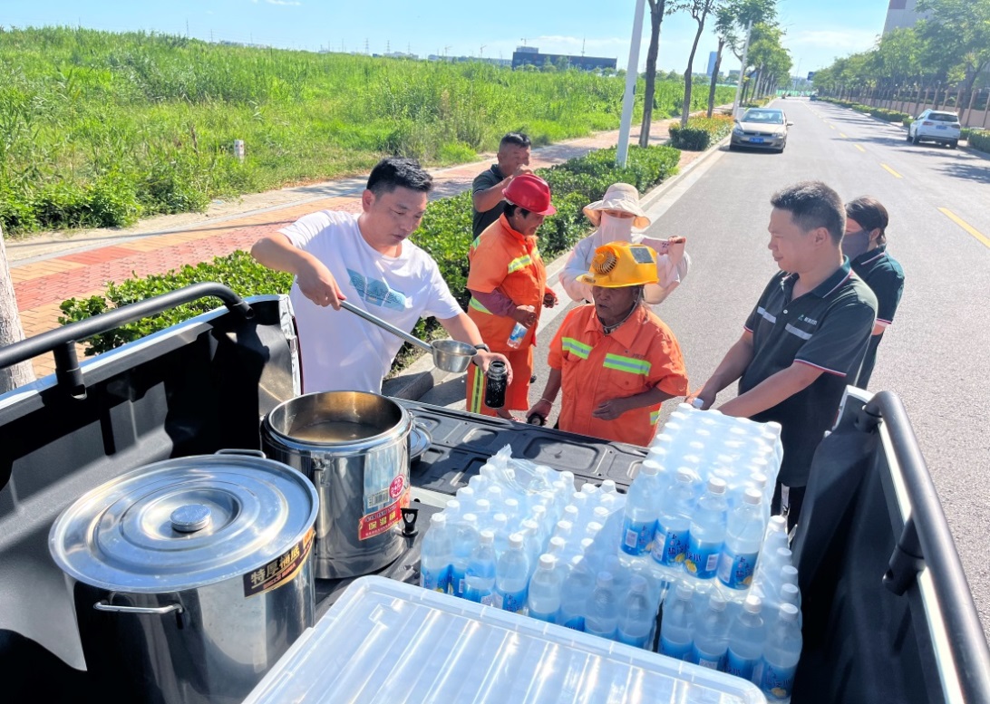 發(fā)放防暑飲品,為工人送清涼。組織各外包單位準備綠豆湯、鹽汽水等防暑降溫飲品,并配送到工人手上,讓每個(gè)工人都能及時(shí)喝到消暑解渴飲品,感受清涼與關(guān)愛(ài)。