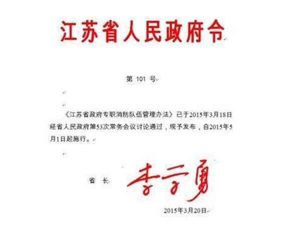 近日,江蘇省省長(cháng)李學(xué)勇主持召開(kāi)省政府第53次常務(wù)會(huì )議,審議通過(guò)了《政府專(zhuān)職消防隊伍管理辦法》(以下簡(jiǎn)稱(chēng)《辦法》)。自2015年5月1日起正式施行。